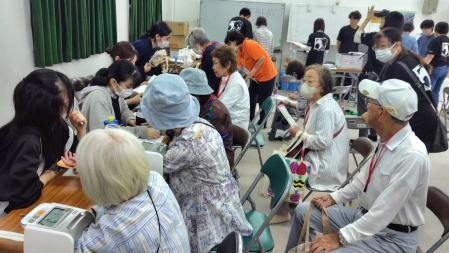 | 令和3年 7月23日 | 毎年、夏祭りの折に、摂南大学看護学部の学生さんに測定して貰ってきた「健康チェック」は、新型コロナウイルス感染症が蔓延したことから夏祭りが実施できず中止になり、健康チェックもありませんでした。 そこで、今年だけスポーツの日になった7月23日、13:00~15:00までの間、松塚ふれあい館集会室において、血圧・酸素飽和濃度・握力・口腔機能・足指圧・骨密度・体組成を久し振りに摂南大学看護学部4回生の学生さんに新調された器具もあり、測定してもらいました。 希望者には健康相談にものってもらいました。 |