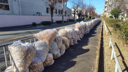 ![]() 落葉収集袋の山(坂氏撮影) 清掃後全員集合 |